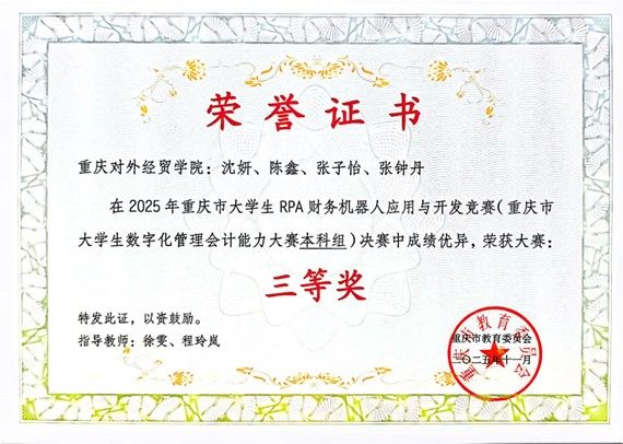 由重庆市教育委员会主办,重庆工商大学、重庆市高等教育学会财经教育专业委员会、重庆市交叉学科专业类教学指导委员会共同承办的“2025年重庆市大学生RPA财务机器人应用与开发竞赛”正式开启。我校积极响应赛事号召,组建参赛队伍,于2025年10月18日参与此次大赛。