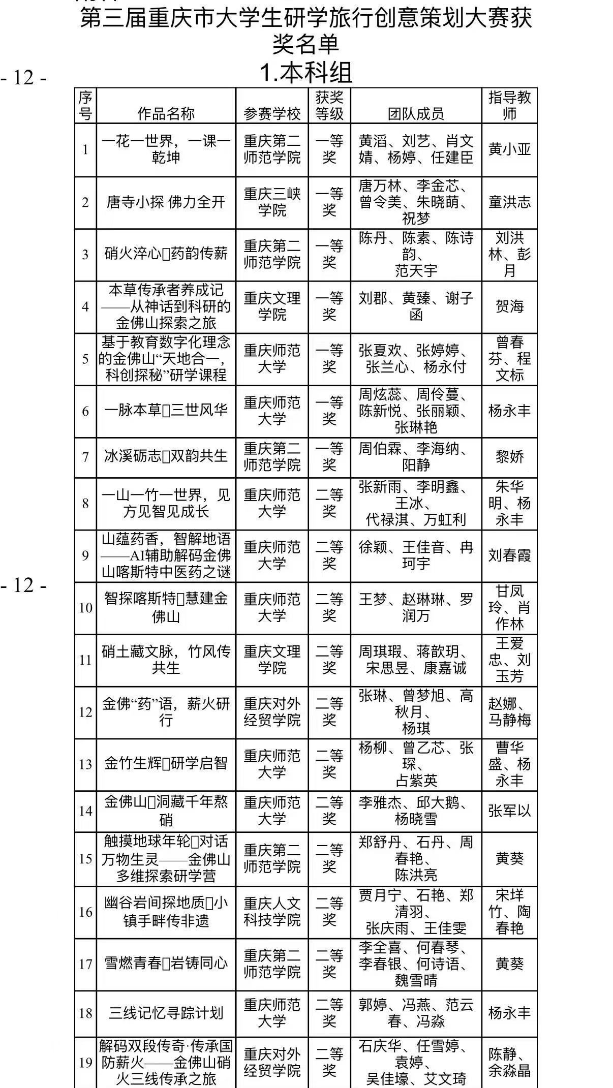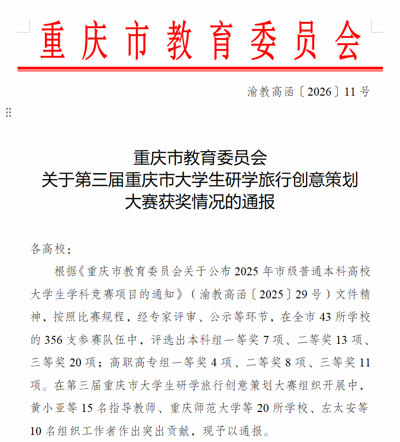 喜报!重庆市教育委员会发布《关于第三届重庆市大学生研学旅行创意策划大赛获奖情况的通报》(渝教高函〔2026〕11 号),我校学子在全市 43 所学校的 356 支参赛队伍中脱颖而出,斩获二等奖 2 项,成绩斐然,为校争光!