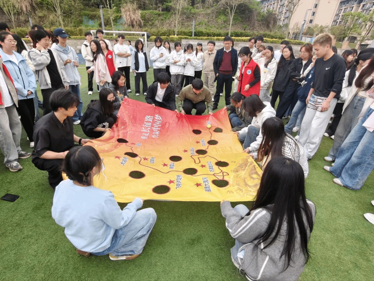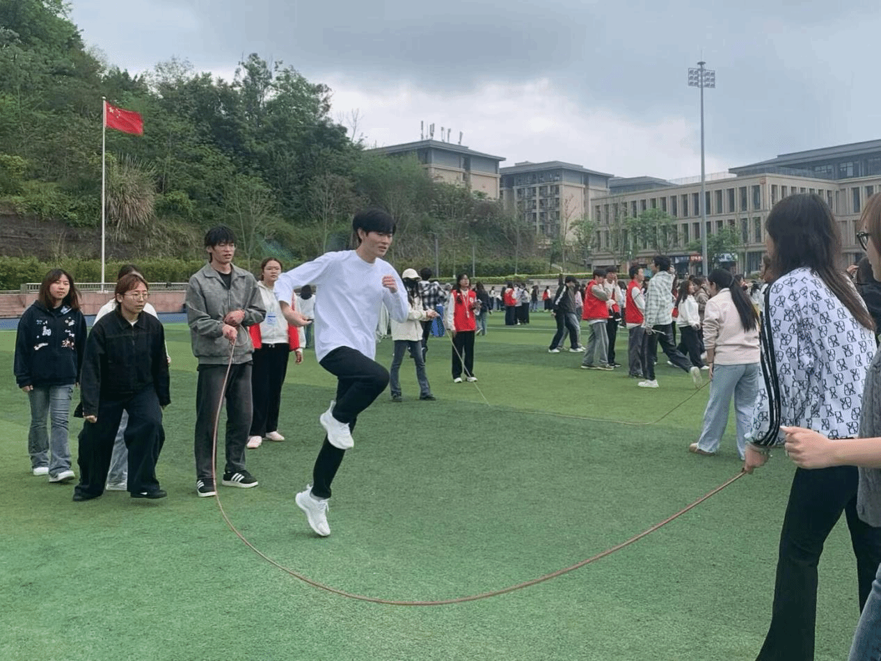 活动伊始,主持人介绍到场辅导员老师,并说明此次活动举办的目的和意义,引导同学们在活动中凝聚共识、增强集体向心力。接着进入“薪火相传·合力共跃”多人跳绳环节,摇绳队员节奏均匀、稳稳把控,跳绳队员步伐一致、纵身跳跃。随后进入“同心向党·红岩破关”快问快答环节,各小组队员以两人三足的形式走到终点快速应答,你追我赶、毫不示弱。最后进入“重走长征·续写华章”滚小球环节,以趣味形式复刻长征路上攻坚克难的精神,各小组队员共同调整地图高低,紧密配合、平稳传递小球,小心翼翼跨越每一段“征程”。