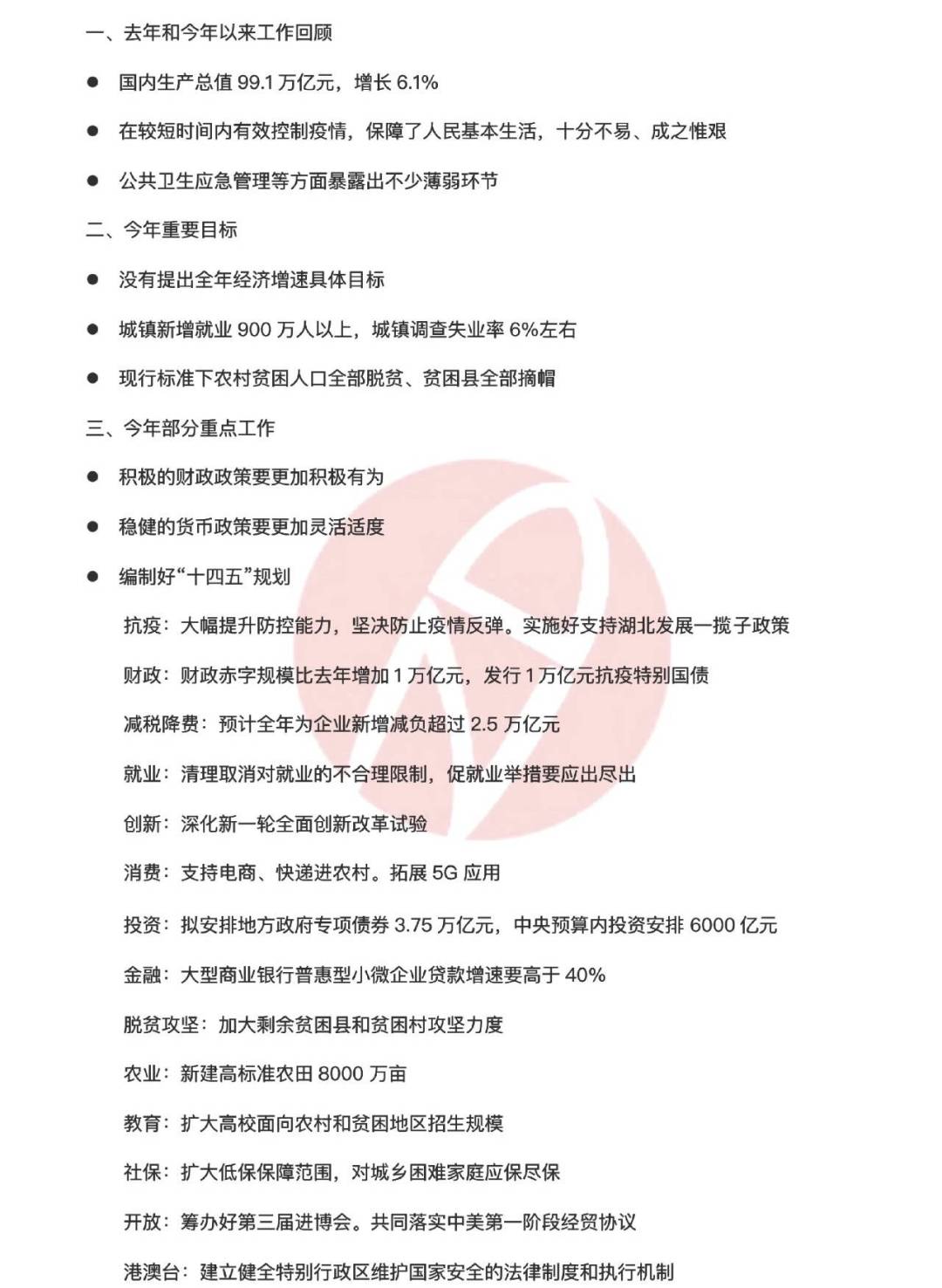 ●杜书锋:今年政府工作报告一个特别之处,在于没有提出全年经济增速具体目标。不再设定经济增长目标,是综合研判国际国内形势,对预期目标作出调整后达成的共识。它反映了中国对自身经济和全球经济形势的一个客观判断,但这并不意味着,中国经济的形势是悲观的。恰恰相反,当前国内疫情基本得到控制,复工复产的节奏和力度,中国经济正走上正轨。但任何一个经济体,从骤停到恢复常态都是需要时间的。因此不设置目标,也表明了政府的认识是非常客观的。
