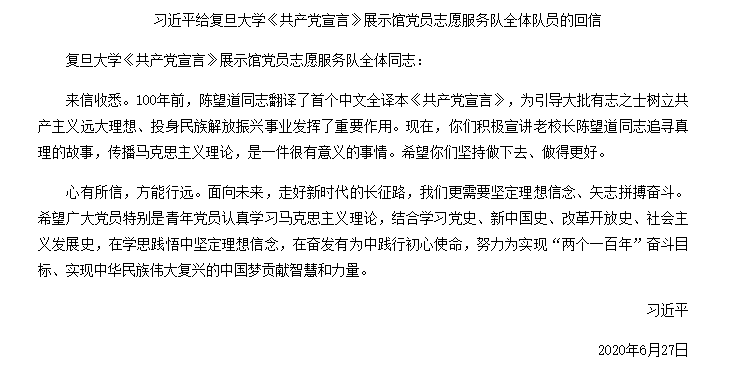学生一支部书记领学学习习近平给复旦大学《共产党宣言》展示馆党员志愿服务队全体队员的回信:学“四史”做到心有所信,鉴古今方能行稳致远。