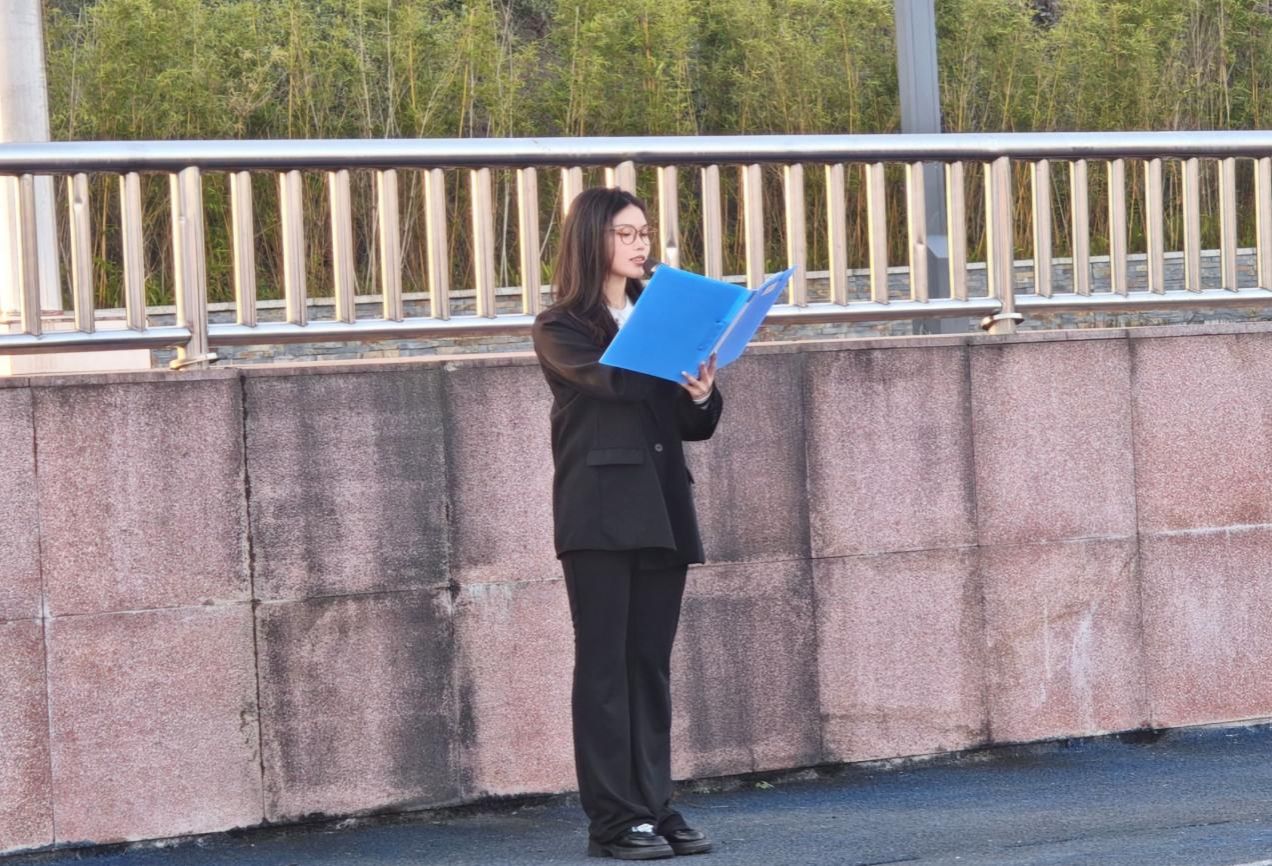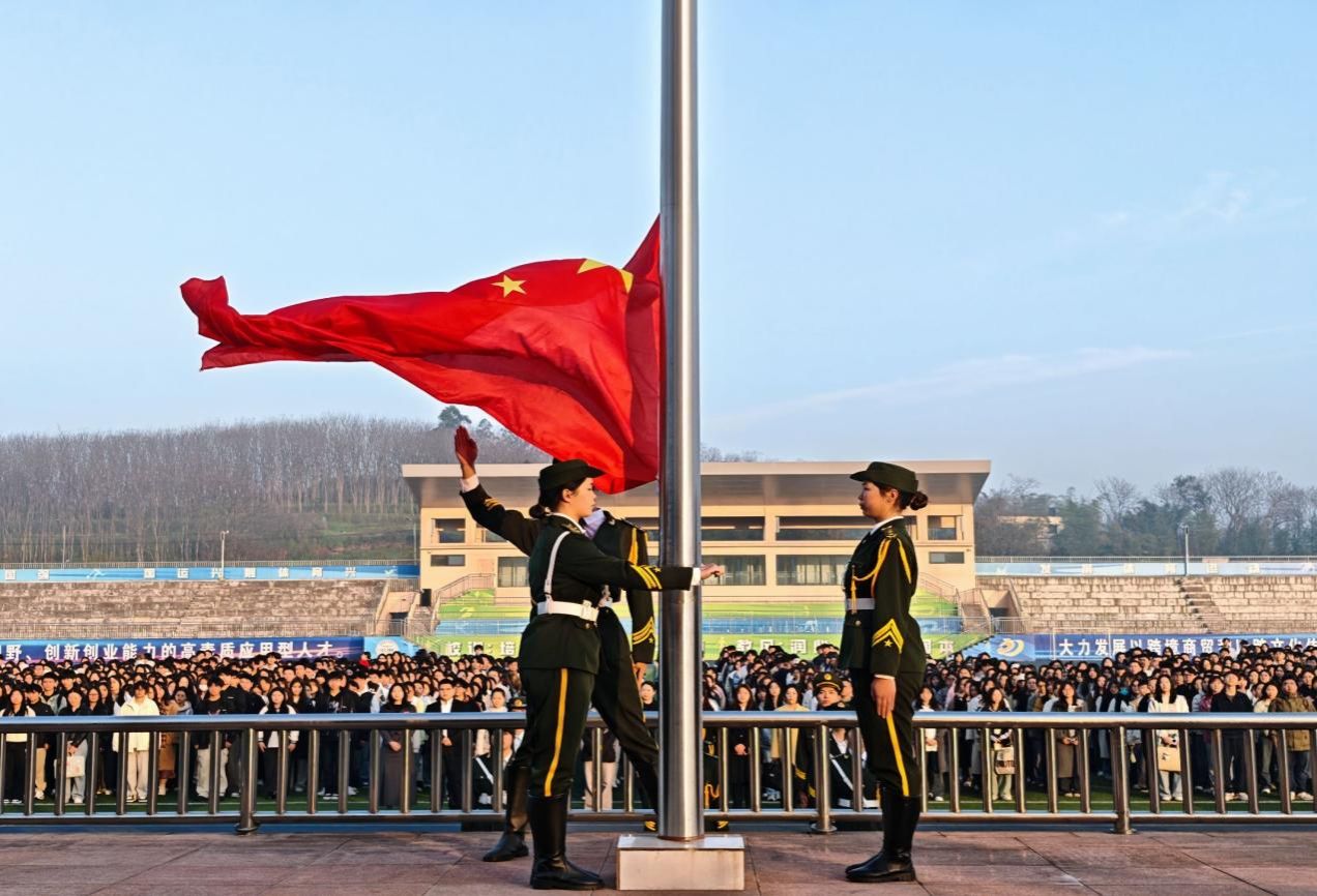 首先,主持人表明学校正处于本科教学工作合格评估的关键节点,为确保评估工作顺利推进,学院成立了学风纠察队,着重加强日常生活、行为规范和课堂纪律等方面的管理;随后,国旗仪仗队的同学们迈着铿锵有力的步伐,护送五星红旗正步走向旗杆,全体师生面向国旗行注目礼,在激昂的国歌声中,鲜艳的五星红旗冉冉升起;最后,学生代表何欣发表关于“创新图强、奋斗意志、知行合一”三点的观点,强调新学期应以创新精神突破自我、以坚韧信念克服惰性,同时倡导知行合一,呼吁同学们将学习扎根实践,在探索中实现成长。
