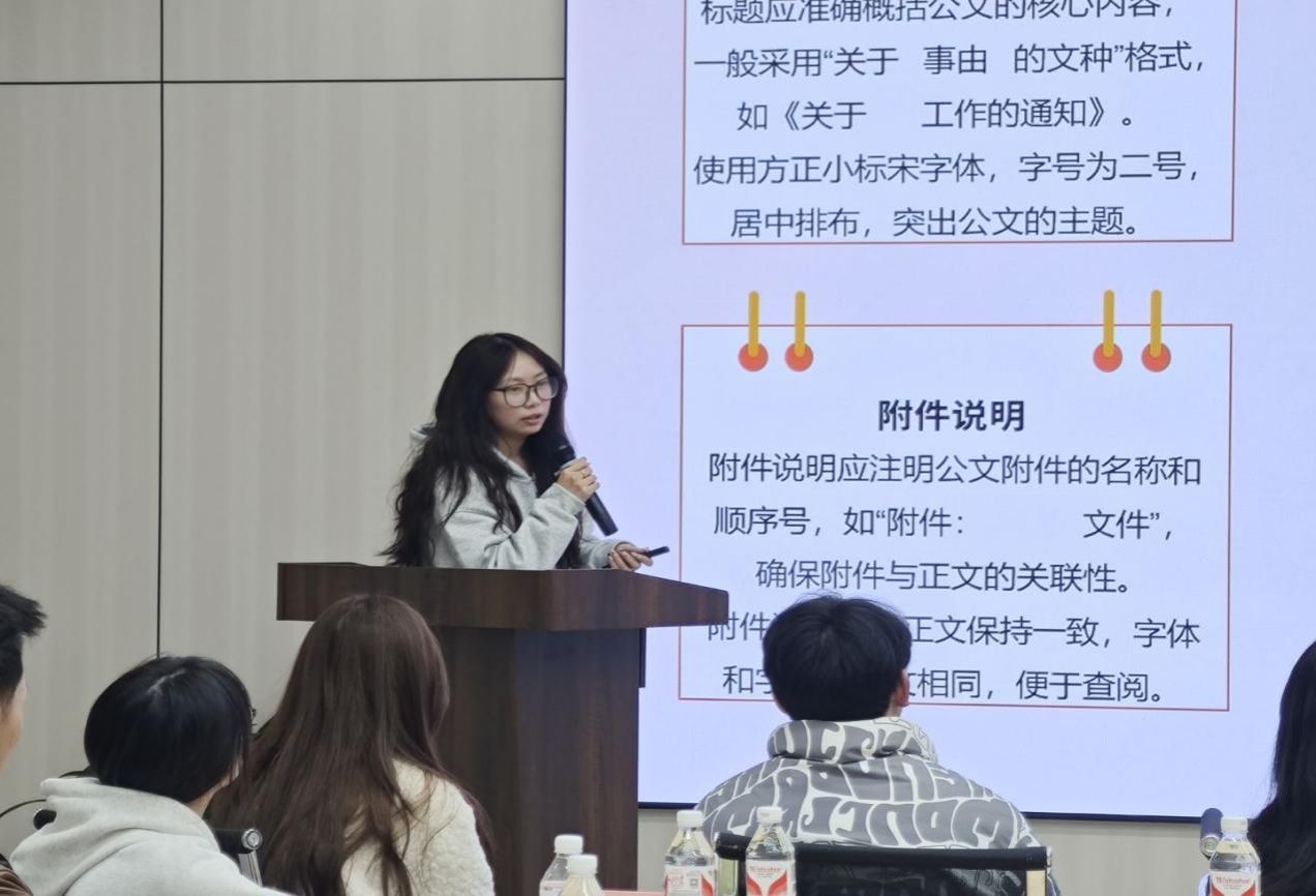 交流会伊始,由主持人何欣介绍出席本次交流会的嘉宾,并对重庆工商大学派斯学院学生会成员的到来表示热烈欢迎,随后由重庆工商大学派斯学院学生会主席团成员何欣蔓就公文基本概念、常见公文类型及格式规范展开宣讲,强调了公文具有“规范性、一致性、正式性”的特点。在自由交流环节,双方就学生分工、公文策划、团队协作等话题深入交流。这一过程,不仅加深对彼此的了解,还拓宽了学生工作的新思路。