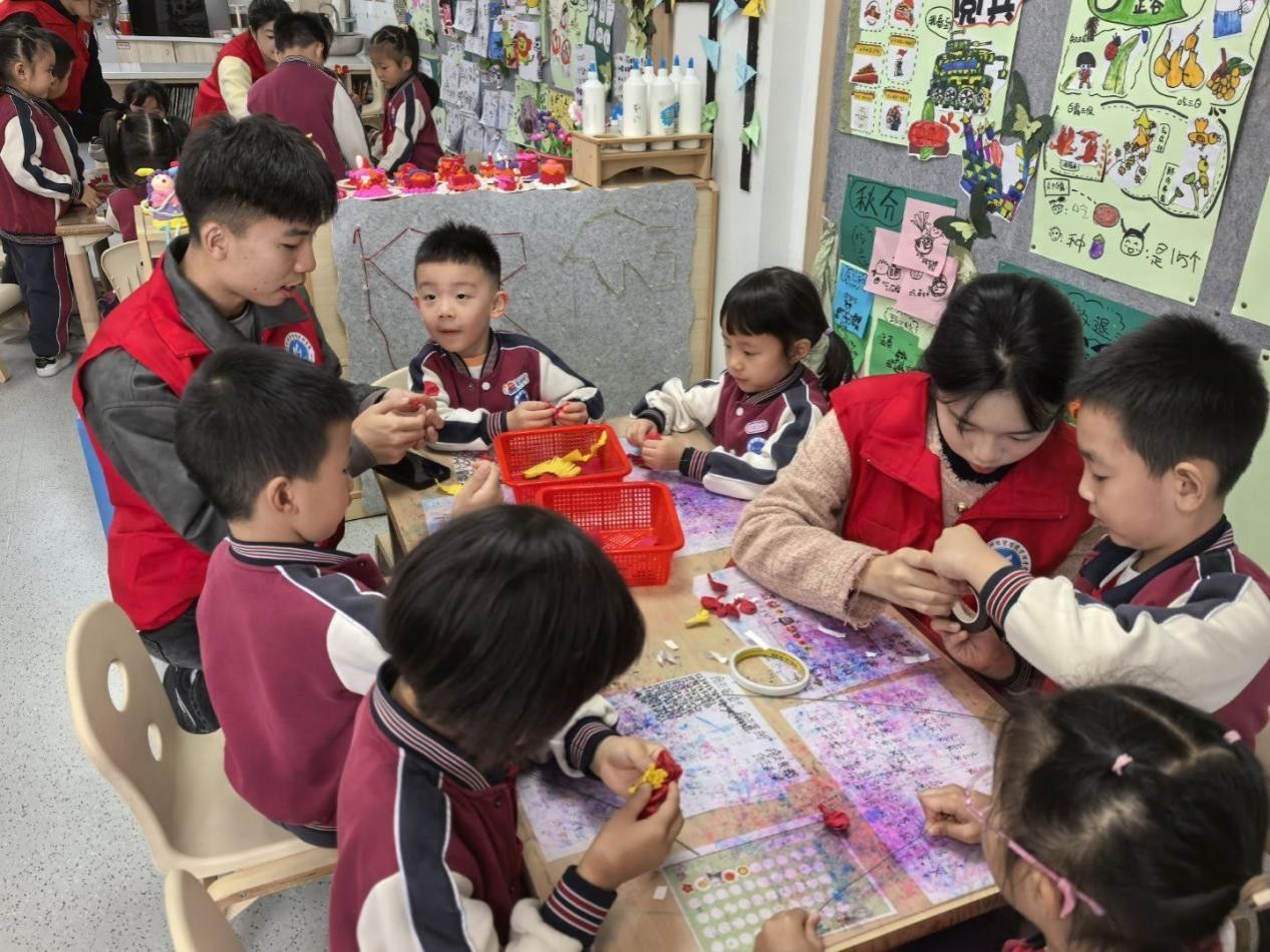 图为志愿者们教小朋友们做手工