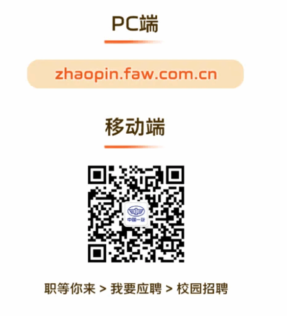 在中国一汽招聘官网或中国一汽招聘公众号注册简历并投递岗位(每位同学可以投递多个企业,在每个企业只能选择一个岗位进行投递)。