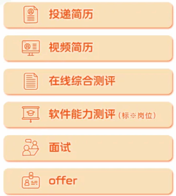 通过简历筛选的同学,将会收到录制视频简历和在线综合测评通知(岗位列表中标※岗位,还会收到软件能力测评通知),测评通过后将收到专业面试邀约。