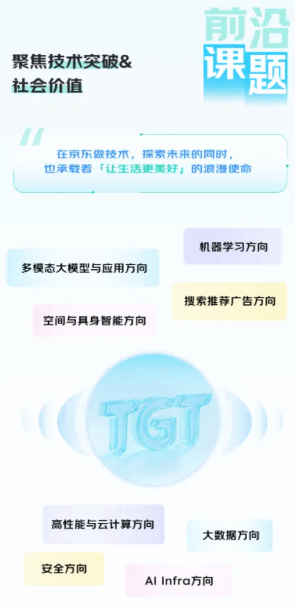 TGT是由京东发起的“顶尖青年技术天才计划”面向全球高校本硕博在校生、应届生及毕业两年内的技术人才开放招募,旨在与全球技术天才一起基于京东丰富的业务场景探索前沿技术、用技术创造更多美好。